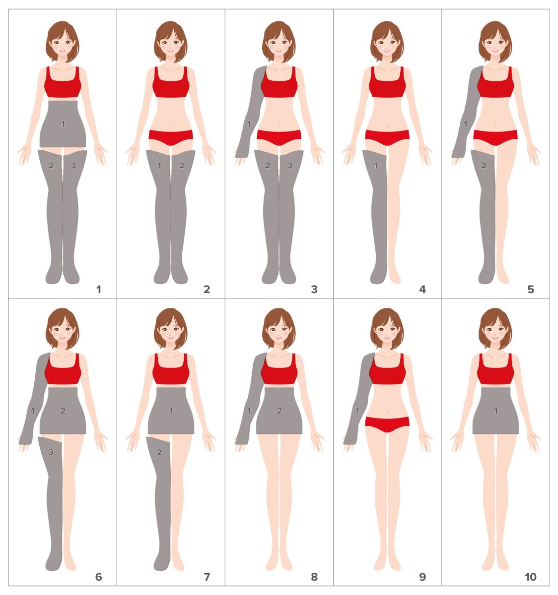 Configurazione Pro con 2 gambali, fascia addominale glutei e bracciale Pressomassage Ekò®: nella configurazione completa con 2 gambali, Kit Slim Body e braccio è possibile utilizzare 1 applicatore oppure 2 o 3 applicatori contemporaneamente, puoi decidere tra 10 possibili combinazioni. Utilizza ogni giorno gli applicatori che più desideri: puoi scegliere la combinazione per il tuo massaggio tra quelle raffigurate in questa tabella.