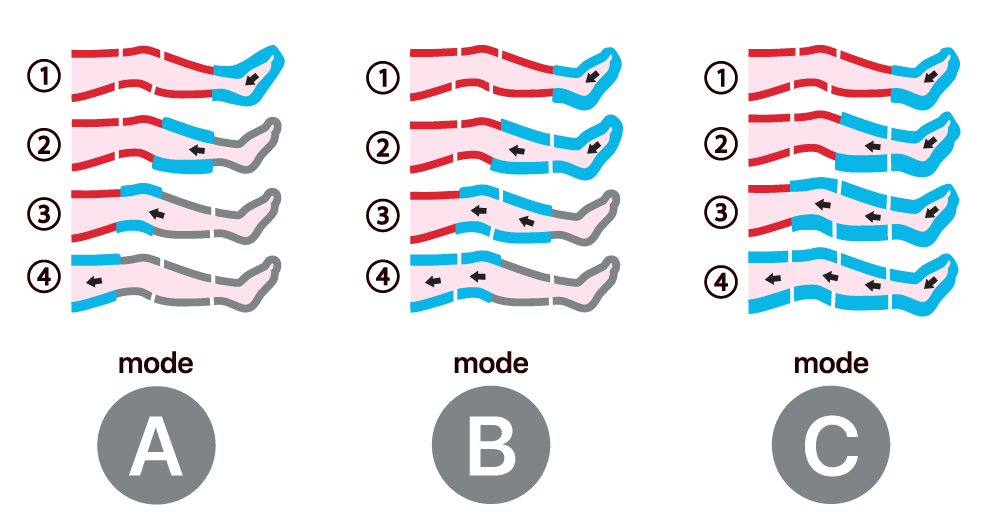 - MODE B: la sequenza del programma prevede il gonfiaggio e lo sgonfiaggio di due camere per volta, per evitare il reflusso di fluidi verso il basso e rendere il trattamento efficace e molto confortevole