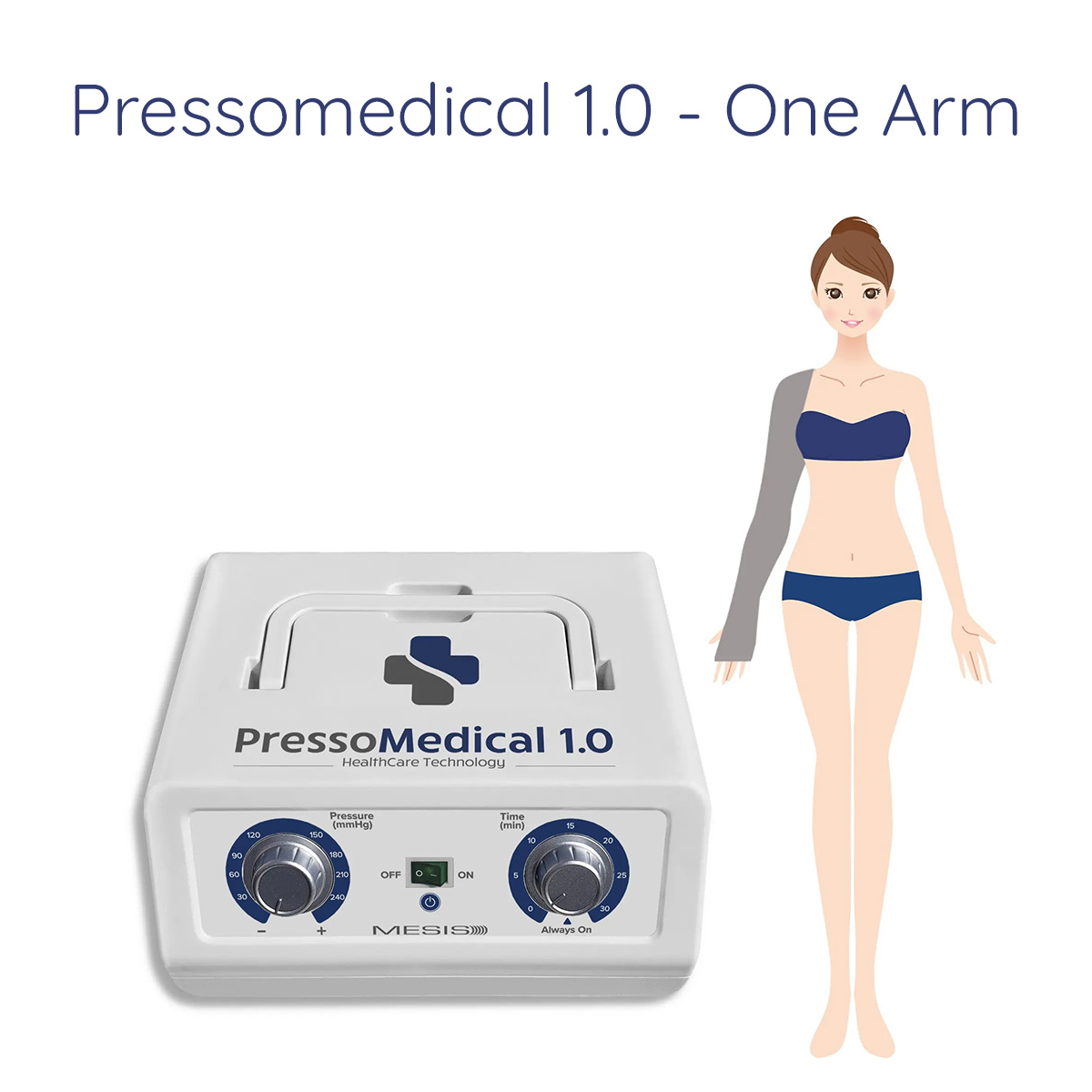 La configurazione comprende l’apparecchiatura, 1 gambale + un connettore singolo e manuale multilingua. E’ possibile acquistare altri accessori in seguito (un secondo gambale, bracciale o la fascia addominale glutei). - Pressoterapia PressoMedical 1.0 One Arm con 1 Bracciale