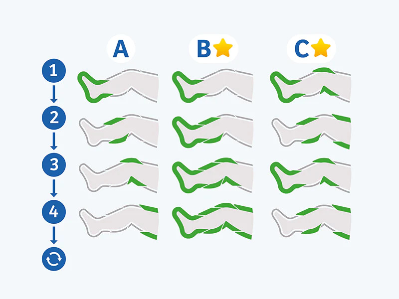 I gambali a camere sovrapposte della pressoterapia evitano sbalzi di pressione tra i cuscini d'aria per un risultato ottimale del trattamento.