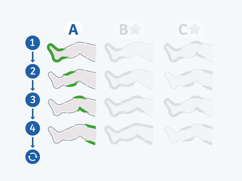 1 programma di massaggio, pressione e tempo di trattamento regolabili da 30 a 240 mmHg. Dotazione 2 gambali a 6 camere sovrapposte.
