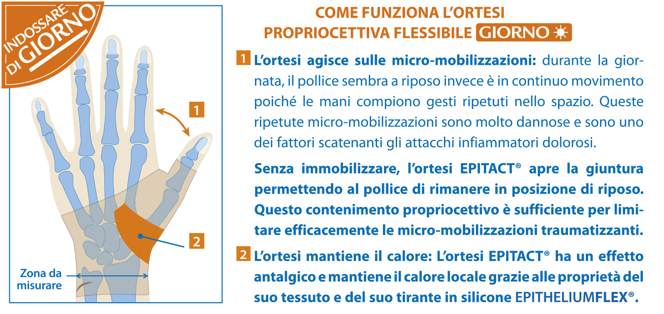 - Senza immobilizzare, l’ortesi flessibile va a mantenere in posizione di riposo il pollice e il 1° metacarpo. Questo contenimento propriocettivo è sufficiente per limitare efficacemente le micro-mobilizzazioni traumatizzanti
