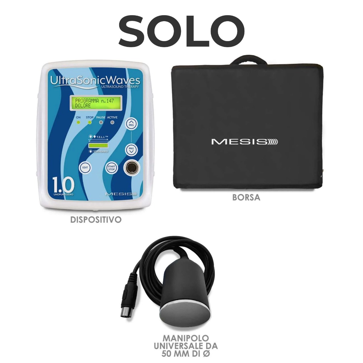 Dispositivo a ultrasuoni per uso domestico e professionale, frequenza 1 - 3 Mhz, emissione continua e pulsata, 313 programmi per dolori, estetica e sport, testina stagna per trattamenti a immersione. Tre configurazioni disponibili.
